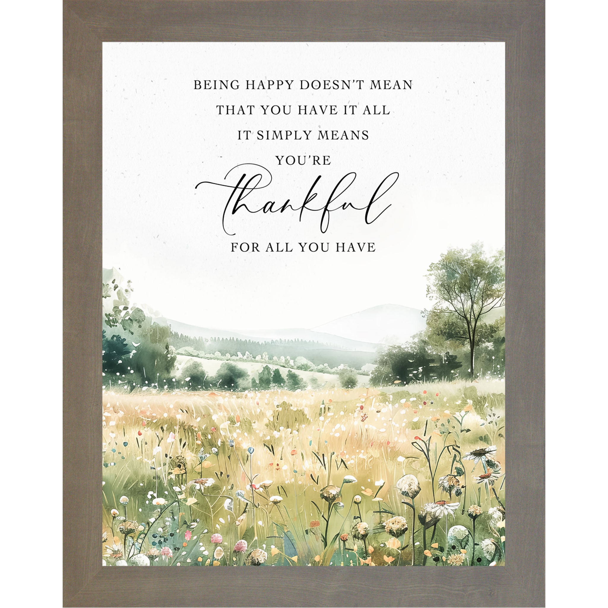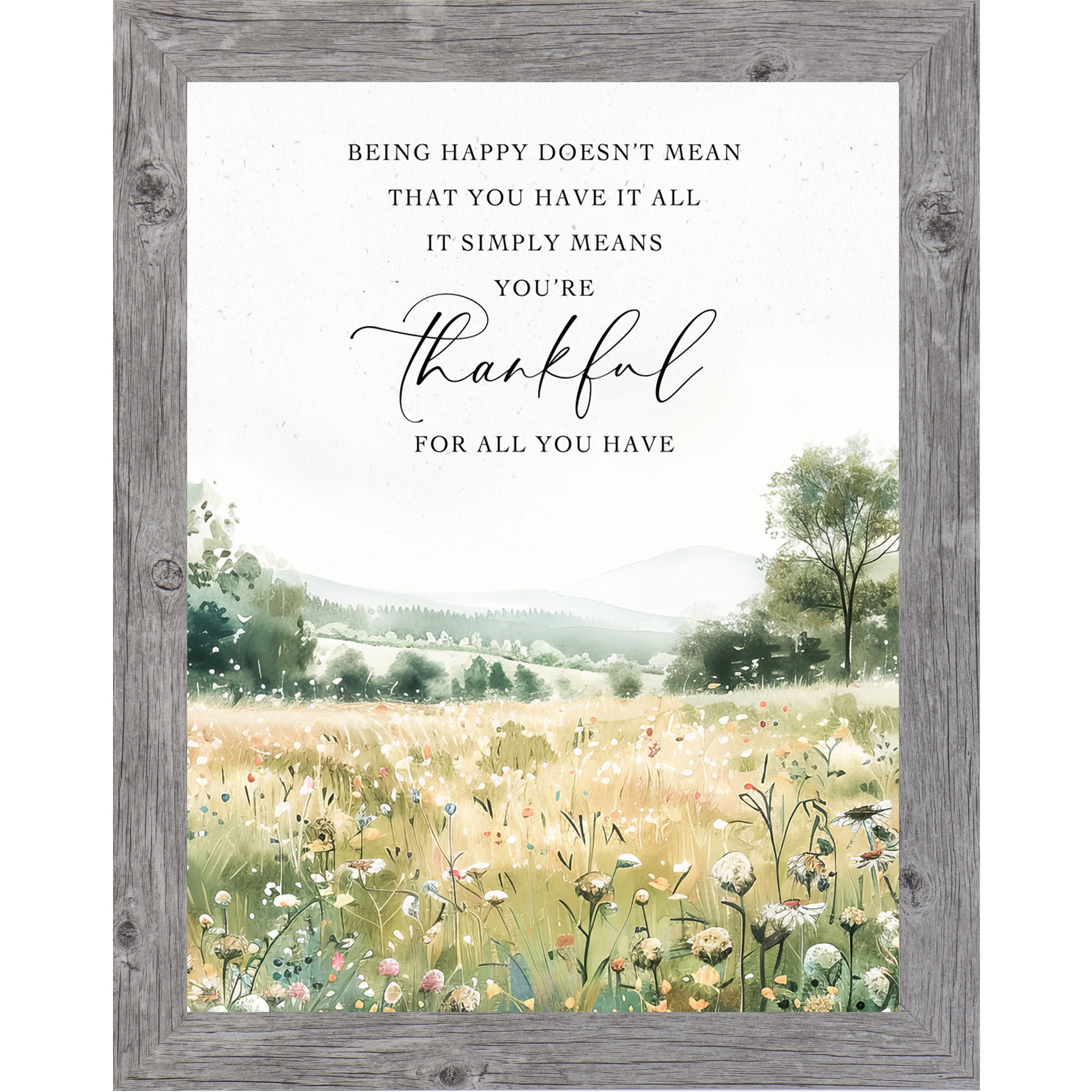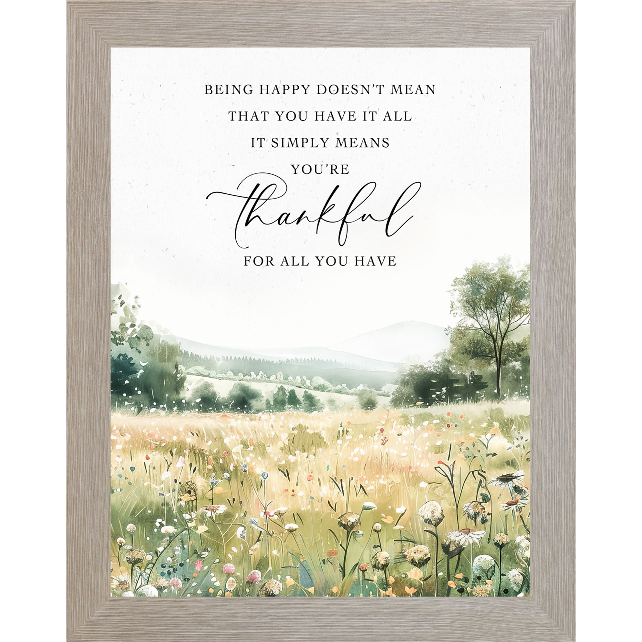 This uplifting watercolor design features a field of soft spring flowers stretching toward distant green hills. The quote reads: “Being happy doesn’t mean you have it all. It simply means you're happy for all you have.” A gentle reminder of contentment and gratitude, perfect for brightening bedrooms, kitchens, or workspaces.