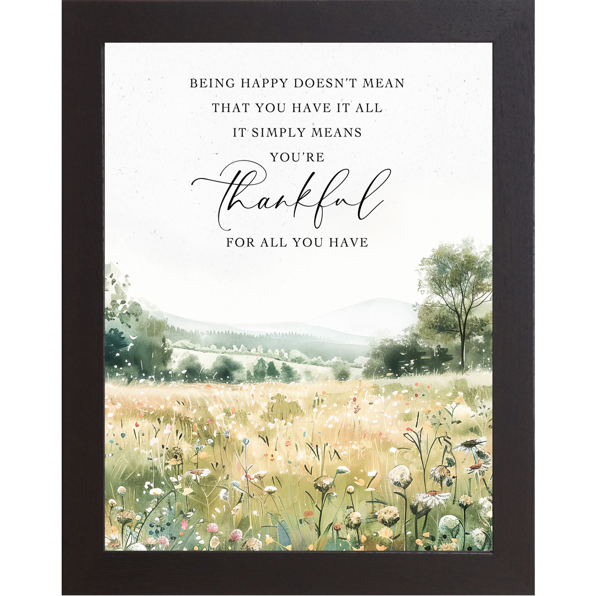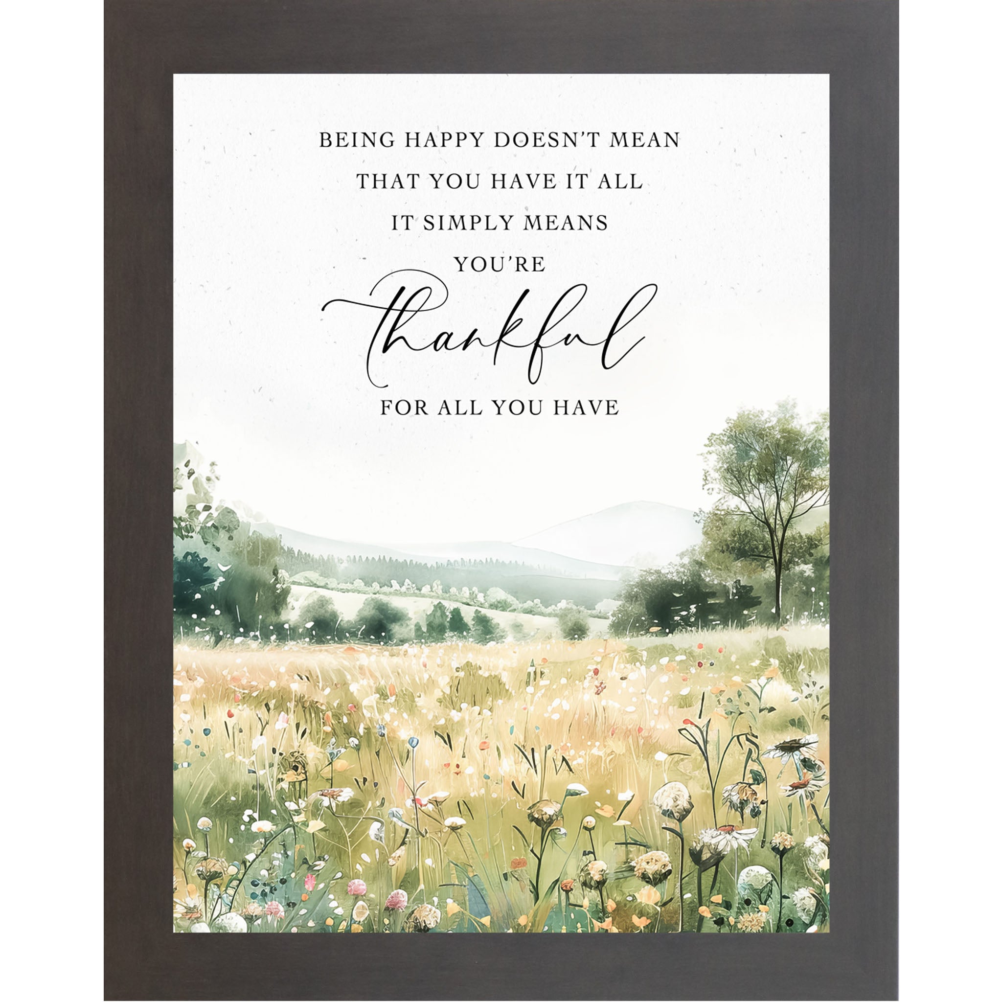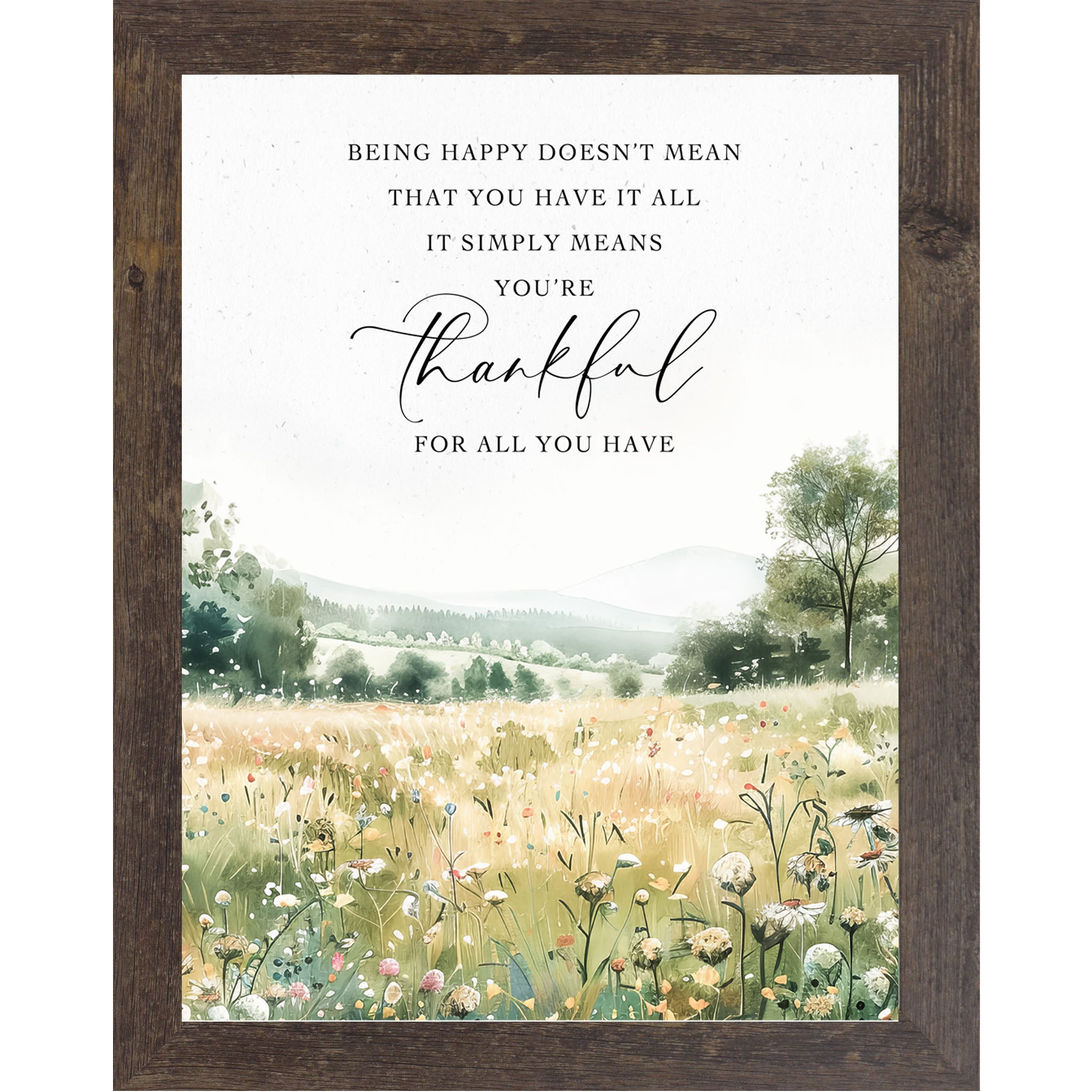 This uplifting watercolor design features a field of soft spring flowers stretching toward distant green hills. The quote reads: “Being happy doesn’t mean you have it all. It simply means you're happy for all you have.” A gentle reminder of contentment and gratitude, perfect for brightening bedrooms, kitchens, or workspaces.
