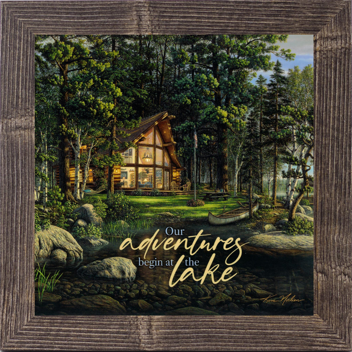Our Adventures Begin at the Lake – Framed Lake House Wall Art with Cabin Scene (KN47)