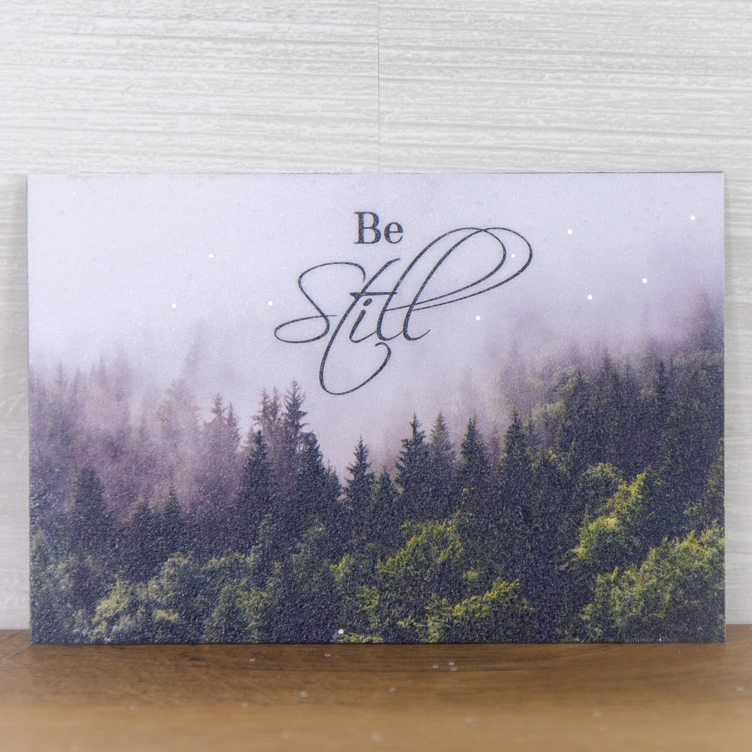 The scene features a forest of green evergreens rising quietly into a misty sky — soft, serene, and full of calm. The simple phrase “Be Still” is centered on the design, letting the message breathe just as it invites you to.
