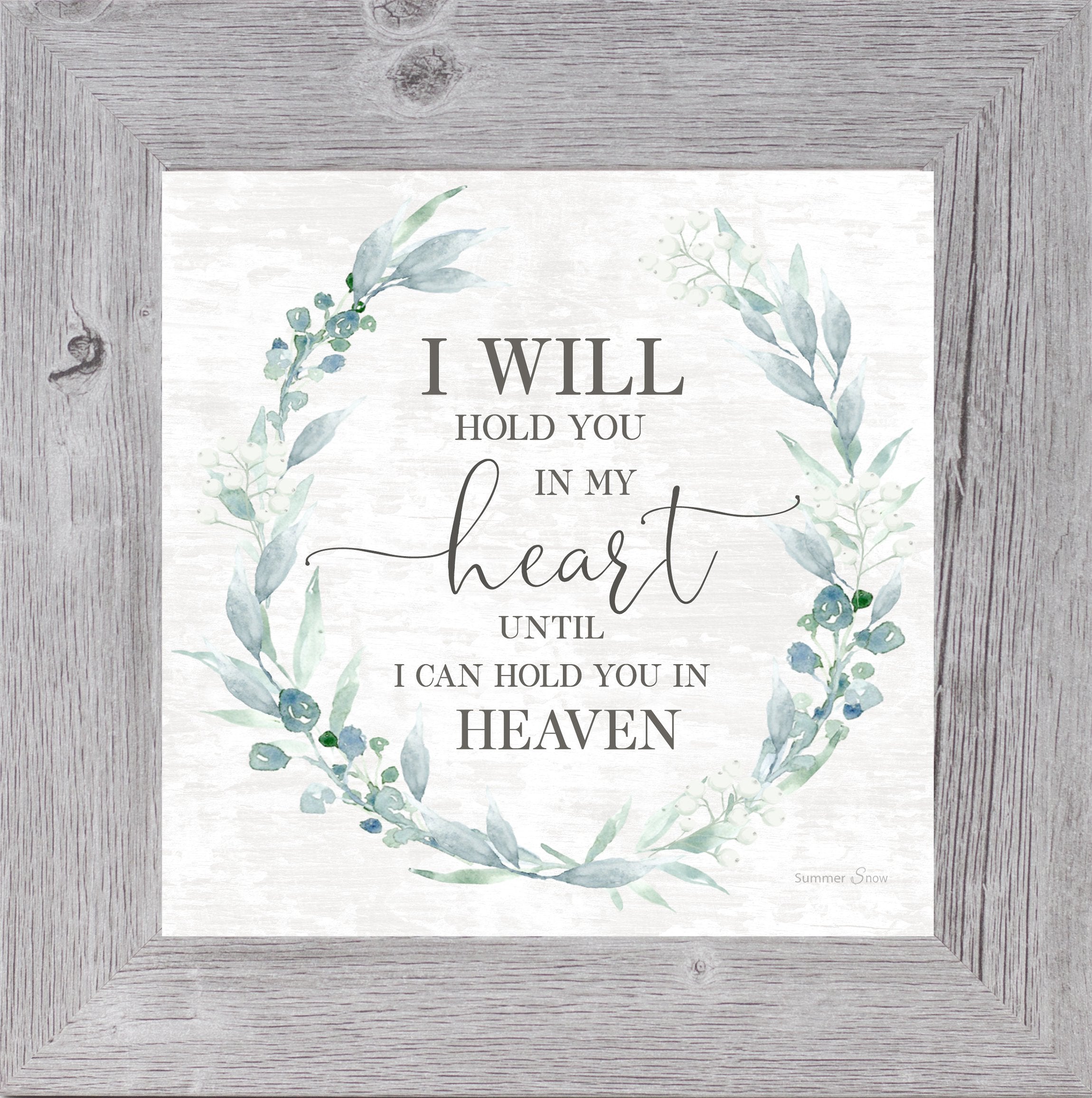 Bring comfort to someone grieving with this peaceful framed print featuring soft green florals and the touching message: “I Will Hold You in My Heart Until I Can Hold You in Heaven.” Each piece is handmade, glittered, and ready to hang or stand. A lasting reminder of love, handcrafted with care in Waukesha, WI.
