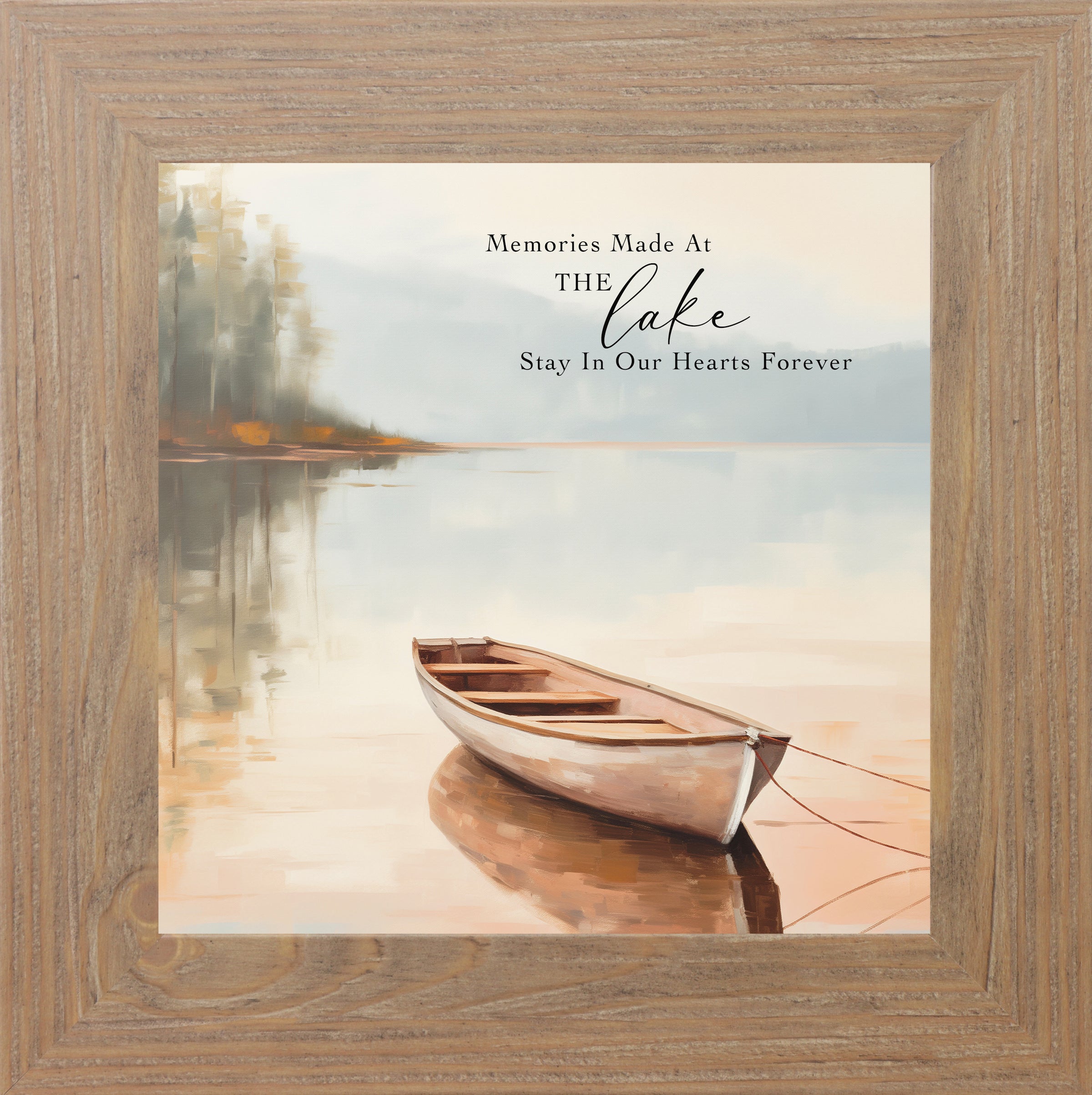 The best lake days never really leave us — they stay in our hearts forever. This framed 8x8 art piece captures the magic of quiet moments by the water, featuring a peaceful watercolor lake scene. A boat rests gently by the dock, pine trees frame the shoreline, and soft reflections dance on the water.